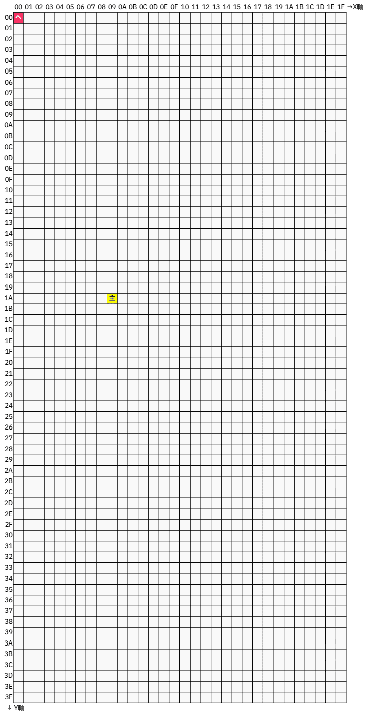 座標からもわかるのだが、この空間はX方向が0~31、Yが0~63まであり、Xが31の時に更に右に移動すると0に戻るし、Yが63の時に更に下に移動すると0に戻るため、