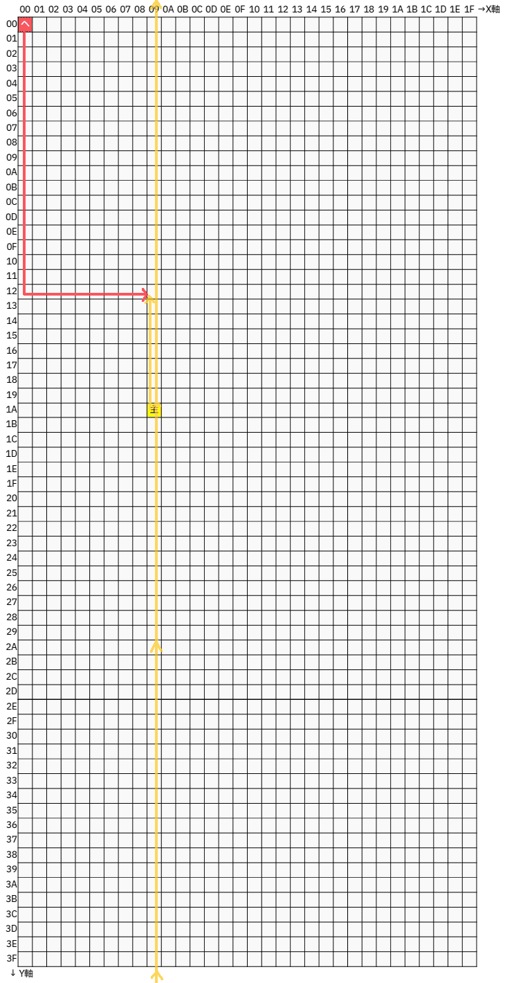 初期位置は($00:13CC, $00:13CE) = ($00,$00)である。