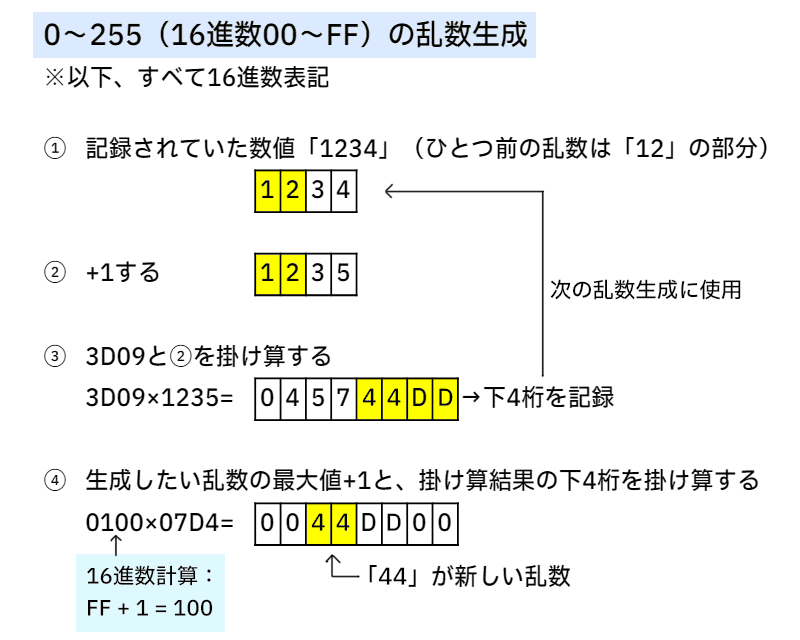乗算計算結果の[$00:0036]、つまり乗算結果の3・4桁目(下からだと5・6桁目の位置)が新たな乱数になる、ということは変わらない。