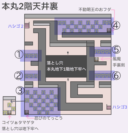 つまりからくり源内を撃破しているため、「地下3階に落とし穴で落下することはない(天草四郎&とりまきのひとだまとの戦闘はない)」「本丸2階・天井裏の落とし穴は停止」という状況である。
